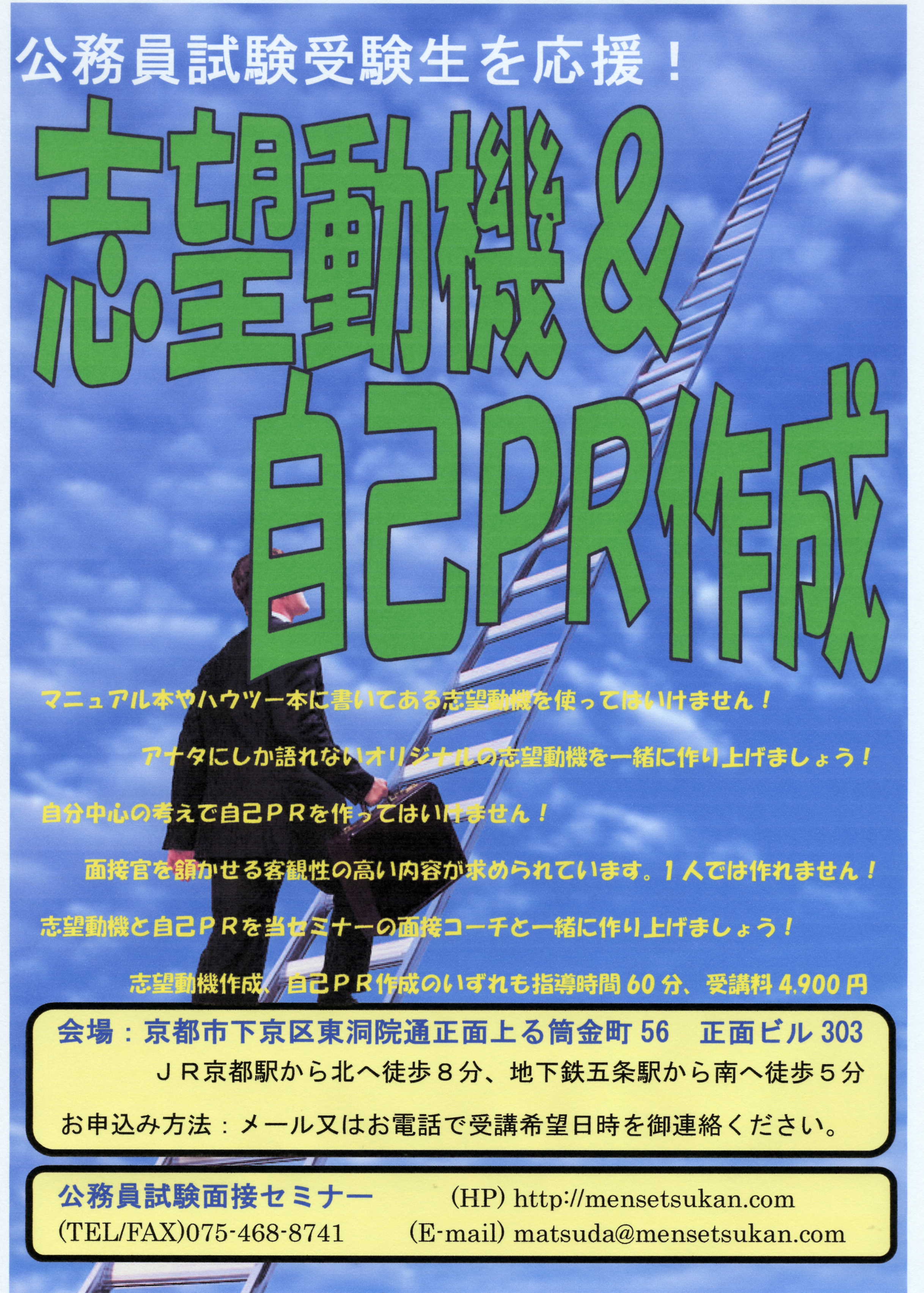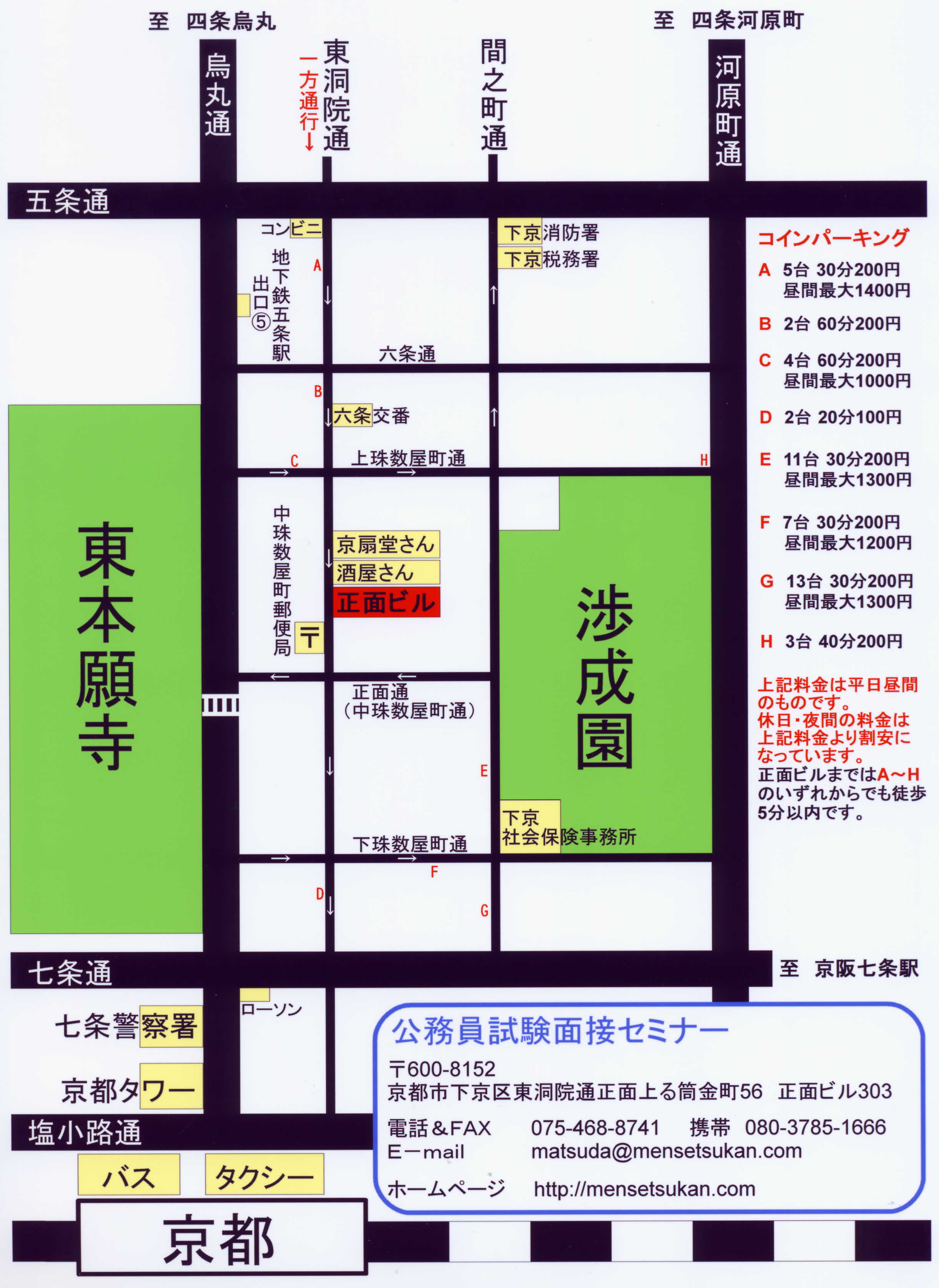 場所は京都市下京区東洞院通正面上る筒金町56正面ビル303の公務員試験面接セミナーです。