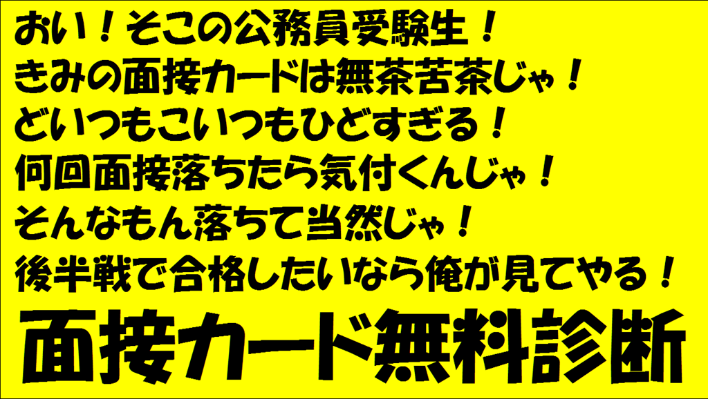 投稿日: 2013年9月20日2013年10月1日面接カード無料診断by面接番長松ちゃん ほんまひどすぎます。 ええかげんに気付きいな。 ありふれた志望動機やめなはれ。 しょうもない自己PR書きなはんな。 そんなんしてたら、永遠に面接落ち続けまっせ。ええんですか? 転ばぬ先の杖。 京都の面接番長松ちゃんが、君の面接カードを徹底的に鍛え直します。 メールで送ってきなはれ。待ってます。