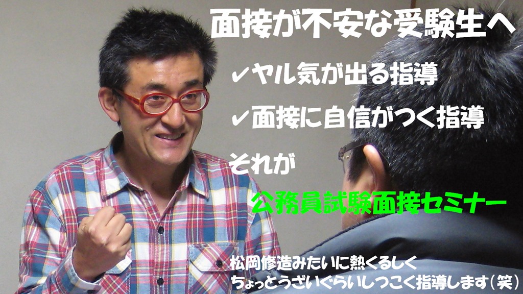 447名合格の最強指導力で君も面接に合格だ。面接地獄脱出で来年は公務員だ。志望動機も長所短所も趣味特技も全部作ったる。遠隔指導もやってるで。ウザイぐらい熱血の面接職人松田佳久に全部任せろ。