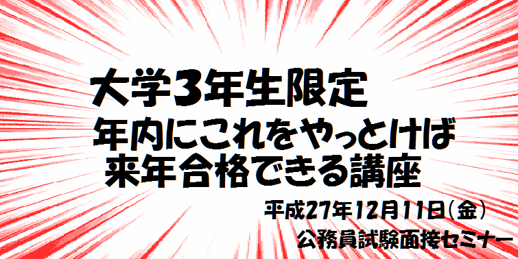 年内最終決戦に死ぬ気で挑め!フルスロットルで取り組めば合格は自動的に手に入る!ヤル気マンマンの君を全面的にバックアップするのが公務員試験面接セミナーだ!