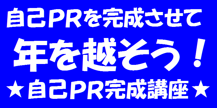 勝てる自己PRを完成する!ネットや面接対策本の内容にそっくりの自己PRでは不合格決定じゃあ!最強自己PRはネットや対策本の中には無い!勝てる自己PRは君自身の中にある!俺がそれを探り当てて磨いてやる!俺にマカセロ!自己PR完成講座は12月24日(木)のクリスマスイブじゃ!