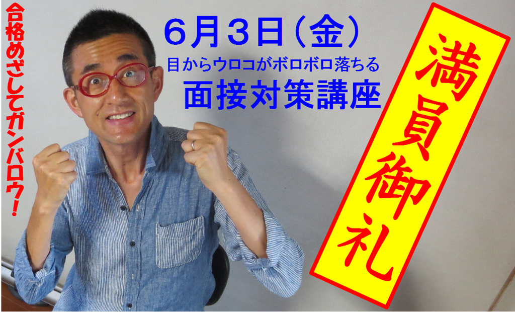6月3日(金)本日の面接対策講座は満席になりました。合格デキル面接カードの作り方、合格デキル質疑応答のやり方をみっちり教えます。目からウロコがボロボロ落ちて合格決定じゃあ!乞うご期待!