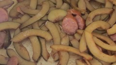 ソーセージを入れて、お鍋で炒めましょう。(^_^)/