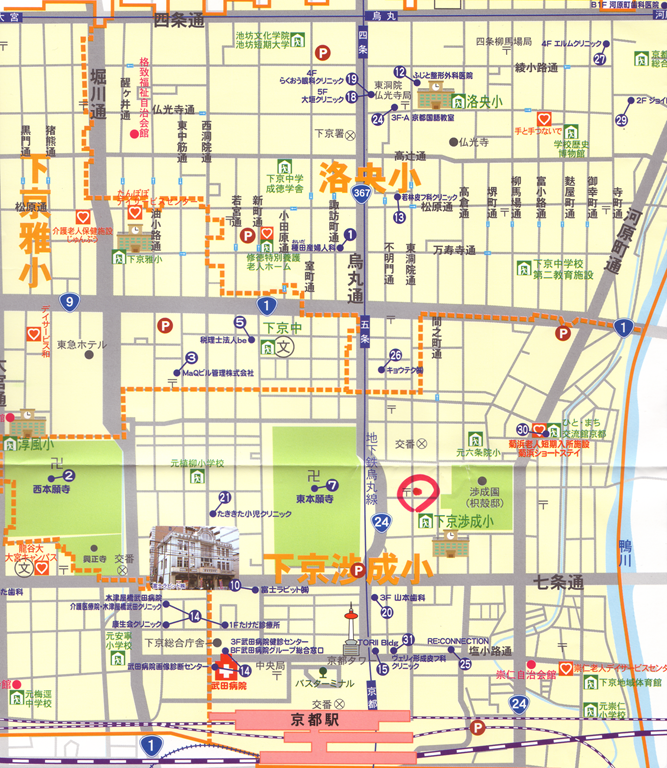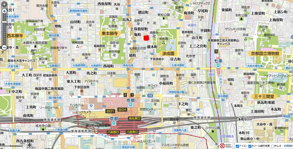 公務員試験面接セミナーは、地図中央のちょっと上、赤色で塗り潰してある所です。京都駅から北へ780m、徒歩8分で到着できます。遠方の受験生は、オンラインで指導しています。当セミナーの目的は、筆記合格面接落ちの泥沼から、受験生を救い出すことです。合格実績340名の面接番長まっちゃんが指導すれば、君も来年4月から公務員として働けます。高倍率の就職氷河期世代採用試験も楽勝です。合格目指して頑張ろうぜ。