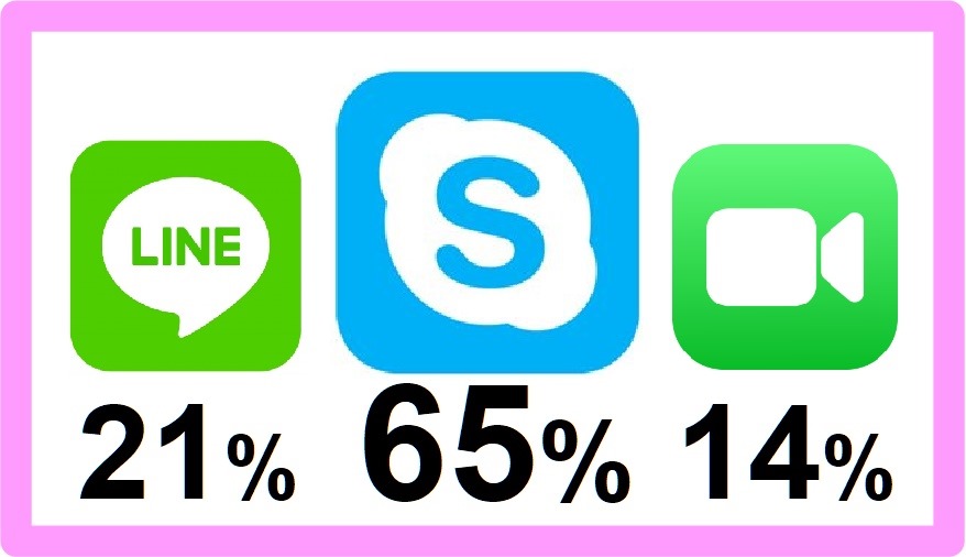 昔は100%スカイプでしたが、最近7年間だとスカイプが65%、ラインが21%、フェイスタイムが14%という結果です。まぁ、それでもラインの3倍、フェイスタイムの4.6倍という1人勝ち状態です。実際、15年間使ってきてわかるのですが、スカイプの通話品質や機能は素晴らしいです。お勧めです。その反対にお勧めできないのはラインです。通話が途切れることが多くて、イライラすることが多いです。面接番長まっちゃんこと松田佳久53歳