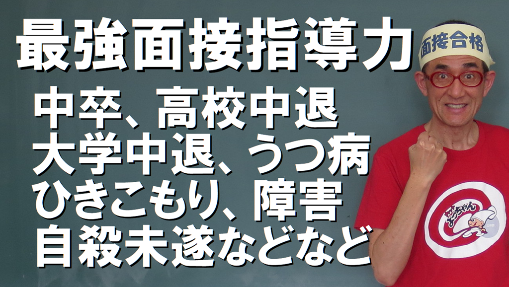 面接番長まっちゃんこと松田佳久53歳の最強面接指導力は、どんな人でも公務員試験に合格させます。中卒でも高校中退でも大学中退でも何ら問題ありません。楽勝で合格させてきました。うつ病やひきこもり、自殺未遂、障害者もガンガン合格させてます。うつ病は3年とか5年とか7年とかです。自殺未遂は睡眠薬とかカッターナイフとかです。障害者は目や耳や心臓や股関節や発達障害などです。そうそう、DV被害者の女性を国家公務員に合格させたこともあります。どうよこれ、最強でしょ。最強面接指導力でしょ。こんなに面接指導力がある人、日本中探しても他にいないでしょ。とにかく、一般的に無理だとか不利だとか言われている人をバンバン合格させてきました。ある意味、公務員受験生の駆け込み寺、最後の砦、再生工場という感じです。刀折れ矢尽きた受験生、万策尽きた受験生の皆さん、私が合格させてあげます。大船に乗ったつもりでお任せ下さい。合格実績359名の面接番長まっちゃん