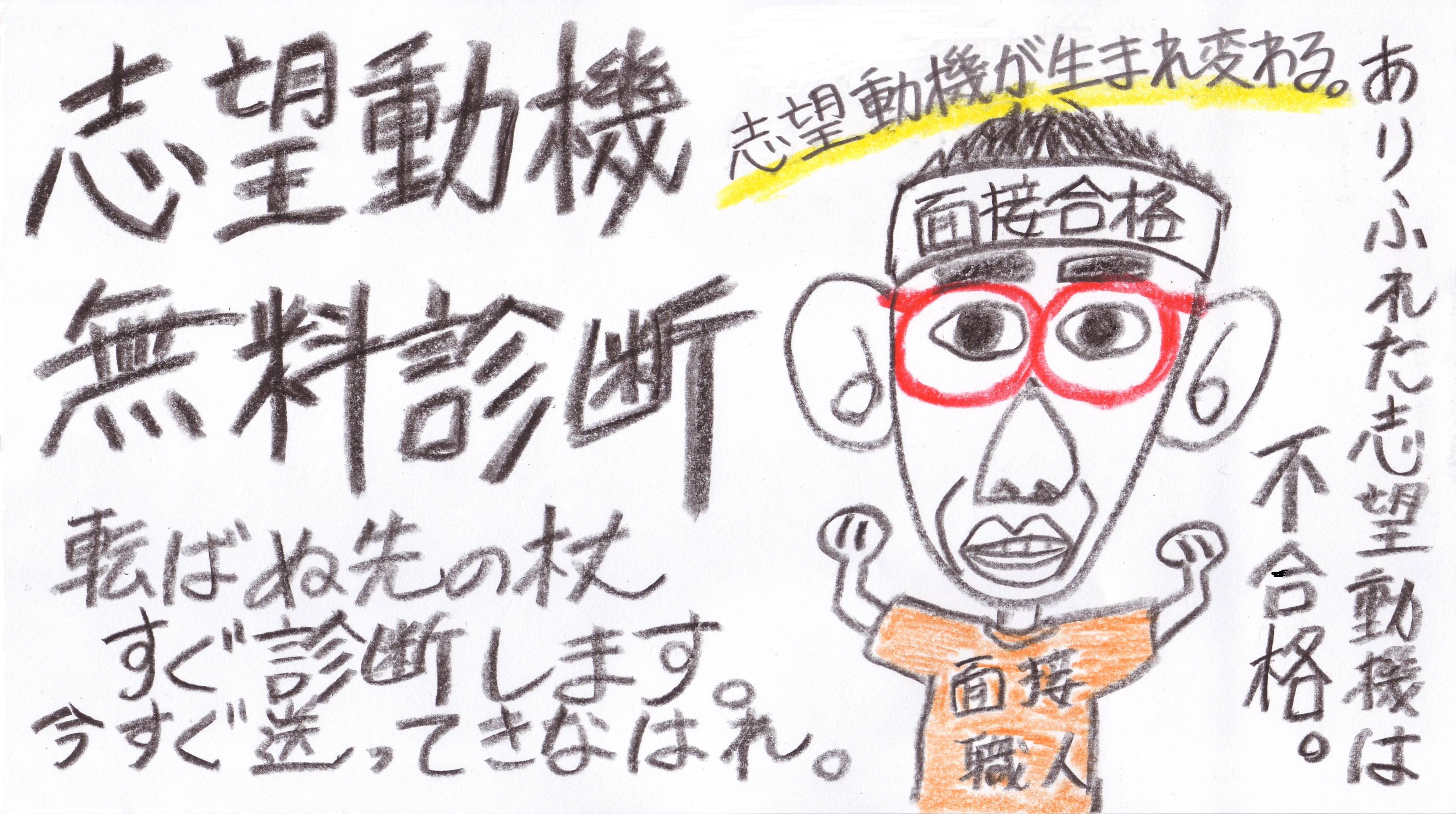 志望動機無料診断は転ばぬ先の杖です。平成18年から実施中。ありふれた志望動機は面接落ち確定です。御注意下さい。誰にも見てもらってない志望動機は最悪です。自分自分の自己中の塊です。提出した時点で不合格です。すぐ診断するので、診断結果を元に改善すれば、楽勝で合格です。下記メールフォームをご利用下さい。Eメールでも結構です。