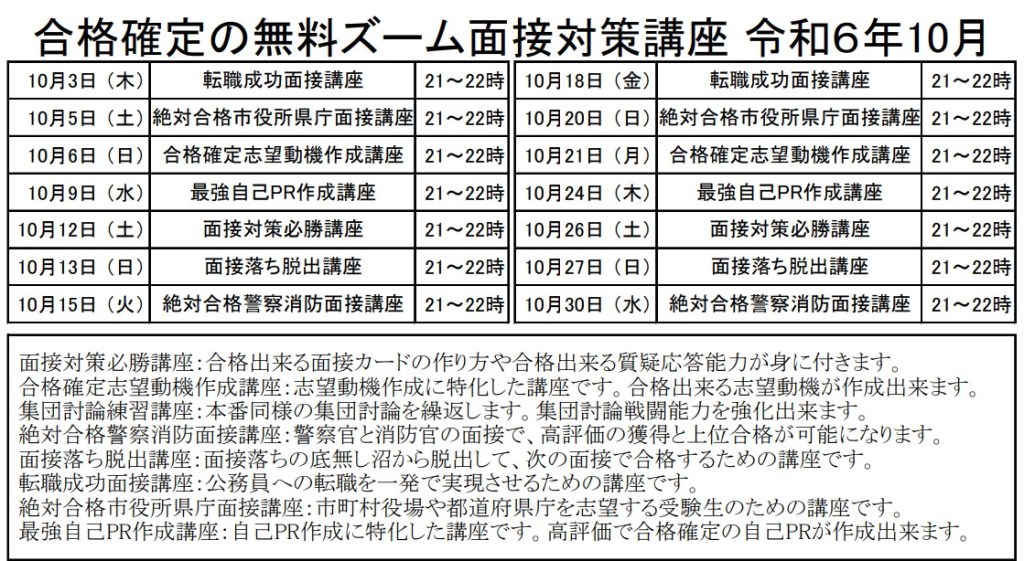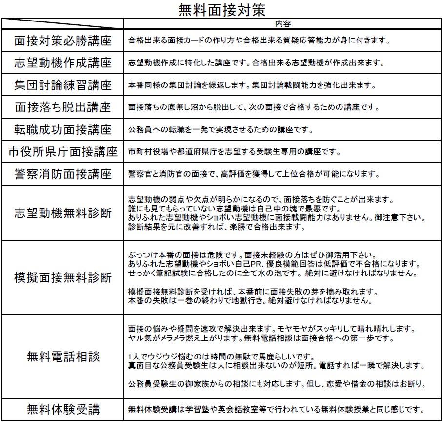 志望動機無料診断、面接対策必勝講座、面接落ち脱出講座、市役所県庁面接講座、転職成功面接講座、警察消防面接講座、無料電話相談、志望動機作成講座、集団討論練習講座、自己PR作成講座、模擬面接無料診断、無料体験受講の12種類